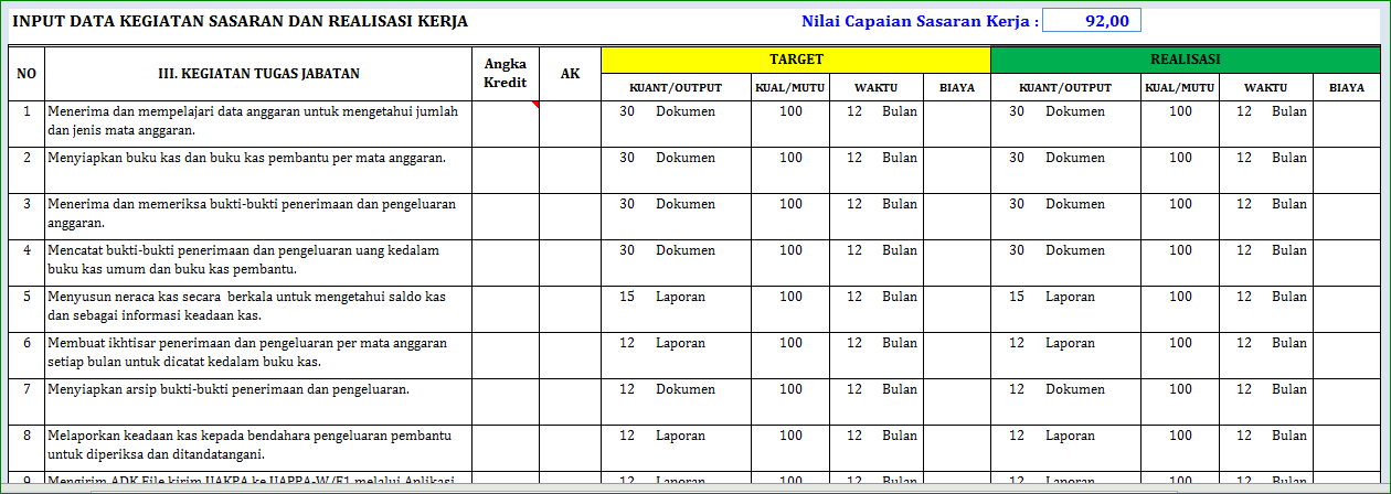 - Isilah realisasi dari target pekerjaan Anda pada kolom berwarna hijau dengan judul "REALISASI" di setiap akhir periode penilaian kinerja Anda.